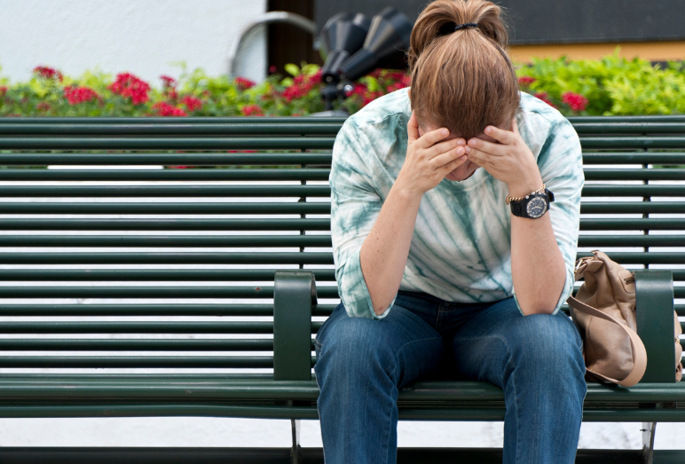 A woman sitting on a green park bench with her head in her hands, appearing distressed, with flowers and a stroller in the background.